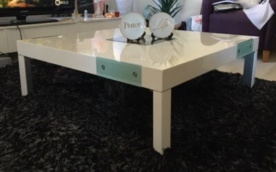 Nick sacli white square coffee table with 4 drawers.